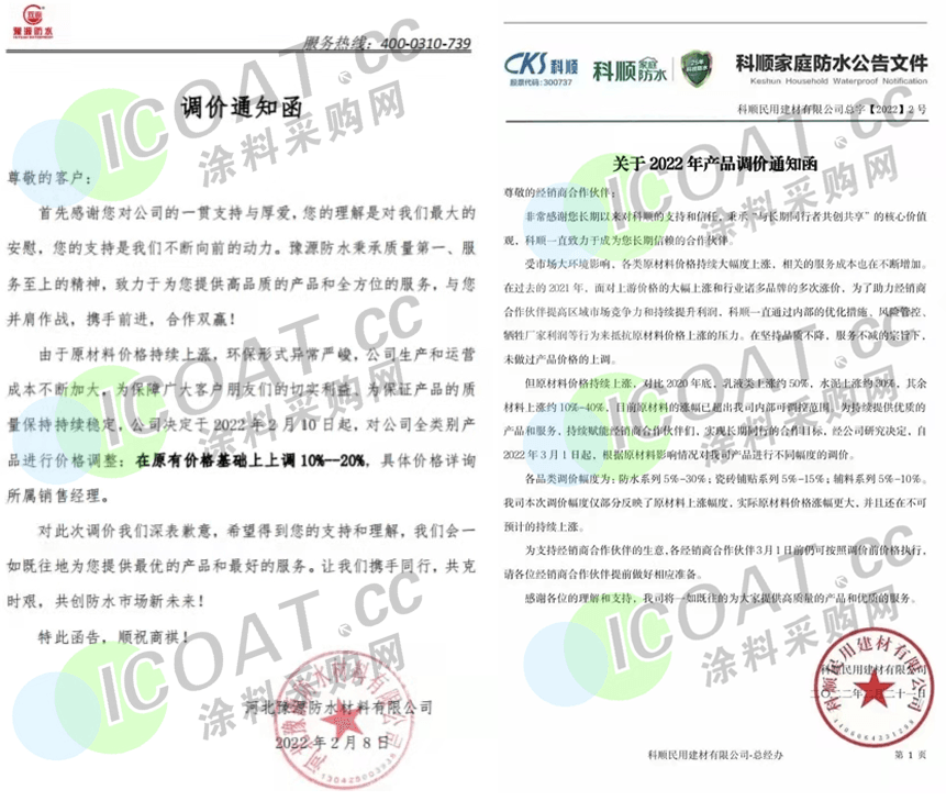 科順防水:3月1日起,對公司產品進行不同幅度的調價。其中,防水系列上調5%~30%,輔料系列5%-10%。