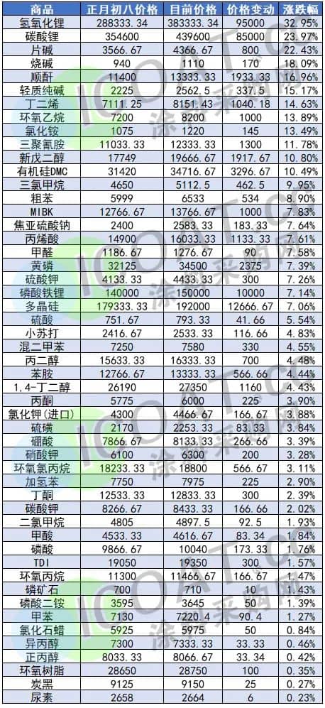 三聚氰胺:目前報價12333.33元/噸,較年后開工價格上漲1300元/噸,漲幅11.78%。