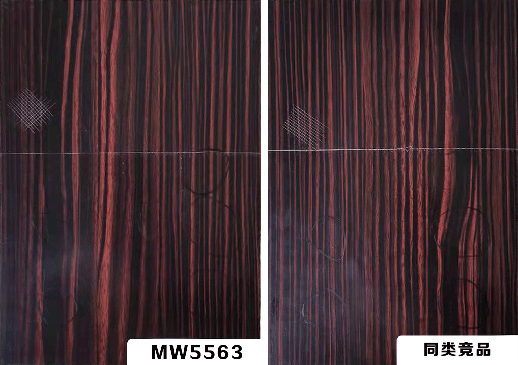 MW556*干膜至清至透,可媲美日系PU高端效果,即使在面漆重涂2—3次的情況下,漆膜依然高透如初,且重涂后光澤差異小。