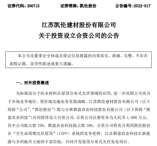 近日,凱倫股份發布公告稱將與吉林棋盤農業科技股份有限公司共同設立合資公司。據悉,該公司注冊資本為人民幣1000萬元,凱倫股份控股比例為70%。合資公司將充分利用凱倫股份在“全生命周期光伏屋頂”(CSPV)系統的競爭優勢,以及棋盤農業科技在新能源與鄉村振興方面的豐富經驗,共同開發屋頂分布式光伏發電項目。