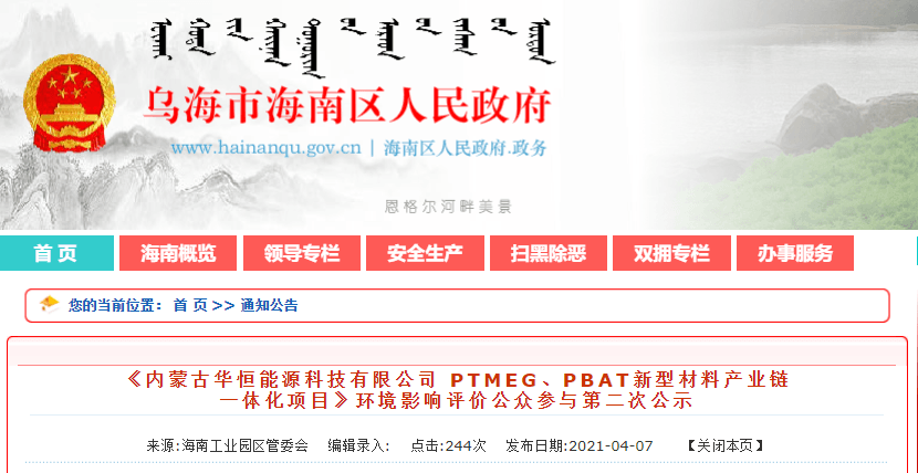 內蒙古華恒能源科技有限公司PTMEG、PBAT新型材料產業鏈一體化項目總投資105億元,建設地點為內蒙古自治區烏海經濟開發區低碳產業園區。