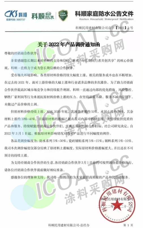 近日,科順防水發布調價通知函,宣布自2022年3月1日起,對公司產品進行不同幅度的調價。其中,防水系列上調5%~30%,輔料系列5%-10%。