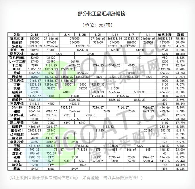 據涂料采購網不完全統計,當前30余種化工品價格較去年年末有所上漲,不同的是,有些是延續去年年末漲勢,連漲7周,比如氫氧化鋰,碳酸鋰等,這也驗證了在新能源賽道拉動之下,上游原料漲勢難停的行情走勢。丁二烯、丙烯酸等石油產業鏈上的產品也普遍在1月中旬開始漲價,與石油價格高位震蕩相符合。另外一些石油產業鏈上的化工品自2月份開始漲價,例如混二甲苯、環氧乙烷等,基本是由產業鏈傳導所致。