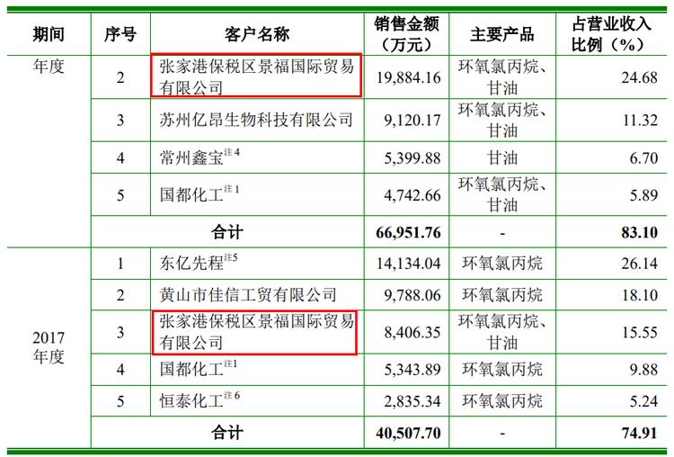 招股書顯示,2017年和2018年間,張家港保稅區(qū)景福國際貿(mào)易有限公司(下稱“景福貿(mào)易”)均為公司前五大客戶,2017年公司對其銷售額為8406.35萬,2018銷售額增至1.99億,占營收比例高達24.68%,為第二大客戶。