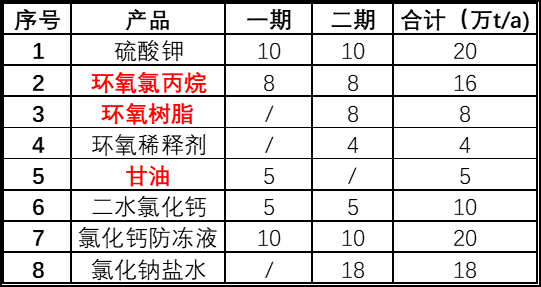 一期:①8萬噸環氧氯丙烷,②10萬噸硫酸鉀,③5萬噸甘油提純,④5萬噸/年二水氯化鈣,⑤10萬噸/年氯化鈣防凍液,⑥各裝置配套公輔設施等;