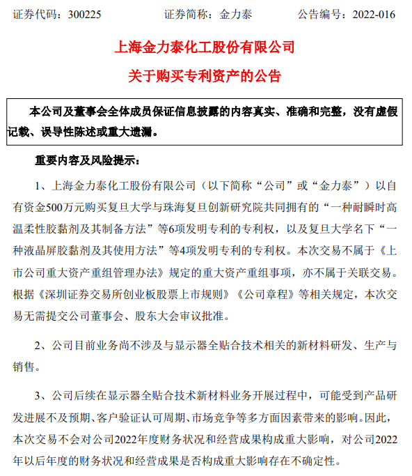 近日,金力泰(或稱“公司”)發(fā)布公告,公司以自有資金500萬元購買復(fù)旦大學(xué)與珠海復(fù)旦創(chuàng)新研究院共同擁有的“一種耐瞬時(shí)高溫柔性膠黏劑及其制備方法”等6項(xiàng)發(fā)明專利的專利權(quán),以及復(fù)旦大學(xué)名下“一種液晶屏膠黏劑及其使用方法”等4項(xiàng)發(fā)明專利的專利權(quán)。共10項(xiàng)專利權(quán)的評估價(jià)值合計(jì)為497.13萬元。經(jīng)各方友好協(xié)商,公司以自有資金人民幣500萬元購買上述10項(xiàng)發(fā)明專利。