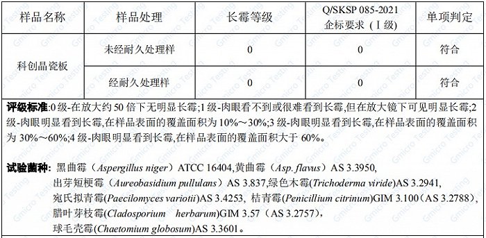 小森科創(chuàng)晶瓷板抗霉菌性能檢測結(jié)果