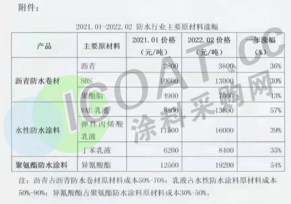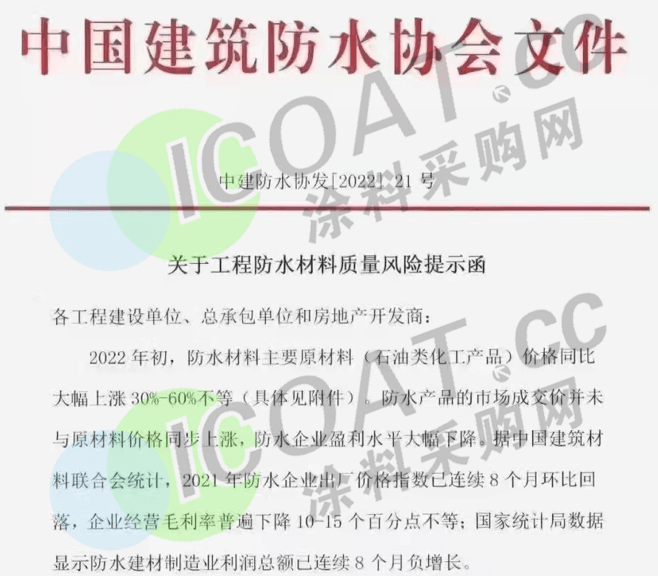 近日,中國建筑防水協會發布《關于工程防水材料質量風險提示函》,稱2022年初,防水材料主要原材料(石油類化工產品)價格同比大幅上漲了30-60%不等,但成品市場交易價未同步上漲,導致企業毛利率下跌10-15個百分點。