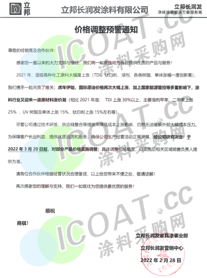 立邦:自3月1日起,對內墻/外墻/木器/基材/輔材等全規格產品預計上調3%-10%。