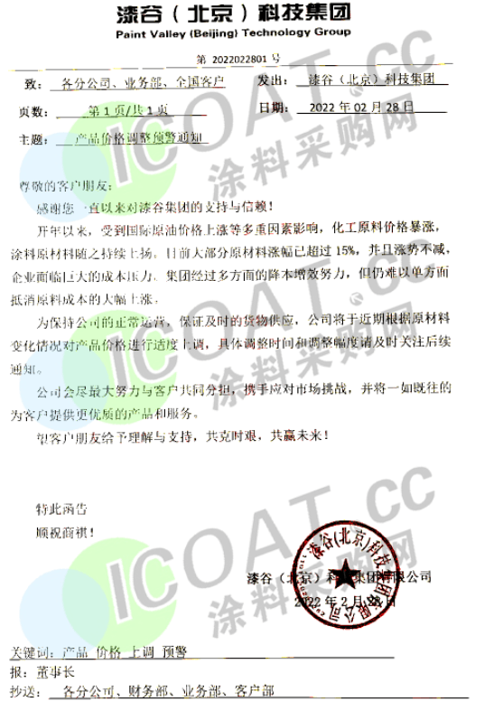 漆谷(北京)科技集團:將于近期根據原材料變化情況對產品價格進行適度上調。