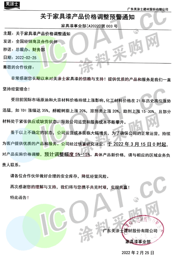 廣東美涂士建材:3月15日0時起,對產品實施價格調整,預計調整幅度5%-15%。