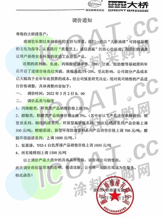 浙江大橋油漆:3月2日起,丙烯酸類、環氧類產品價格上漲5%,醇酸類、酚醛類產品上漲5%。氨基漆,Y02-1白色厚漆產品價格上調1000元/噸,所有稀釋劑上調1500元/噸。