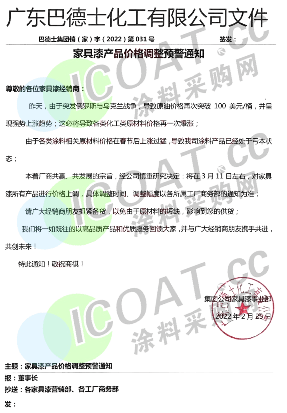 巴德士集團:3月11日左右,對家具漆所有產品進行價格上調。