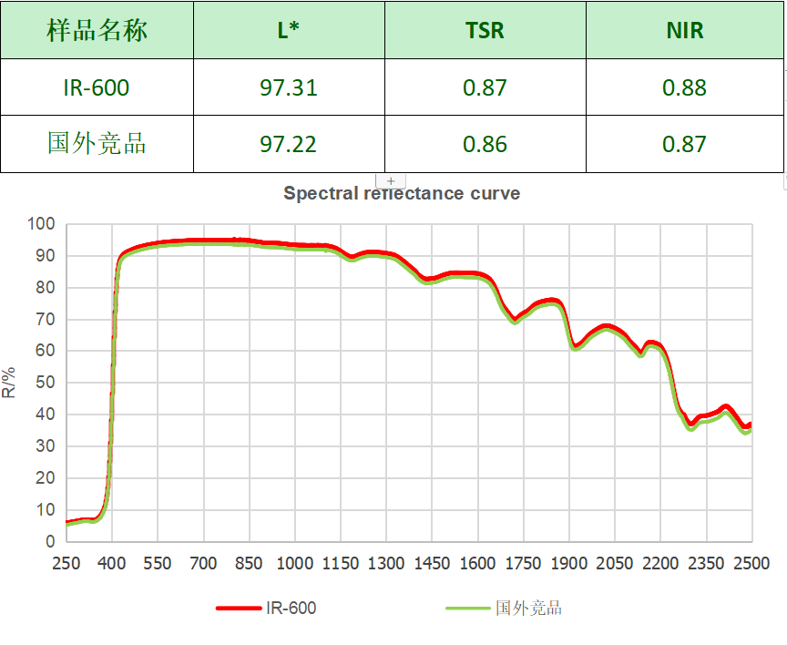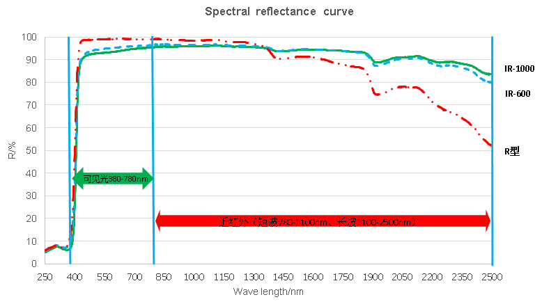 由于IR系列近紅外反射二氧化鈦合理的粒徑及其分布,使得產品在近紅外尤其是近紅外長波段的反射相較于顏料級R型鈦白粉有很大的提高。