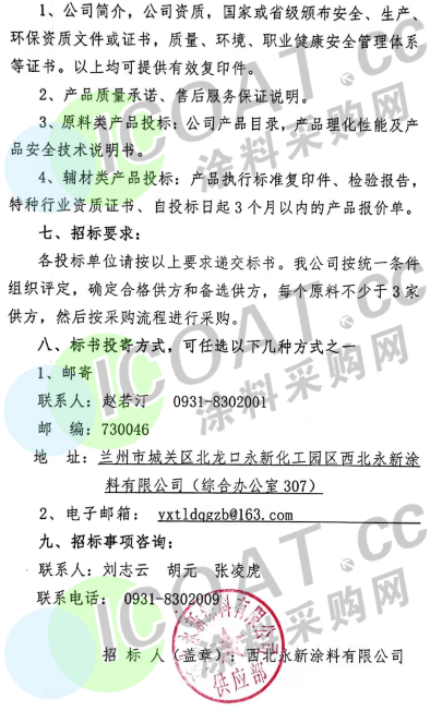 四、投標地址:西北永新涂料有限公司(蘭州市城關區北龍口永新產業園)