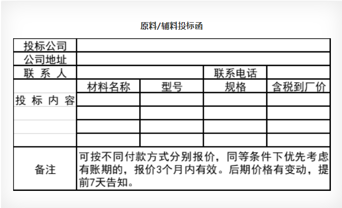 各投標單位請按以上要求遞交標書。我公司按統一條件組織評定,確定合格供方和備選供方,每個原料不少于3家供方,然后按采購流程進行采購。