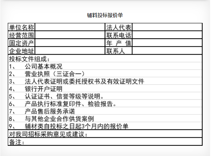 4、輔材類產品投標:產品執行標準復印件、檢驗報告,特種行業資質證書、自投標日起3個月以內的產品報價單。