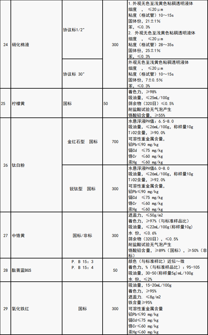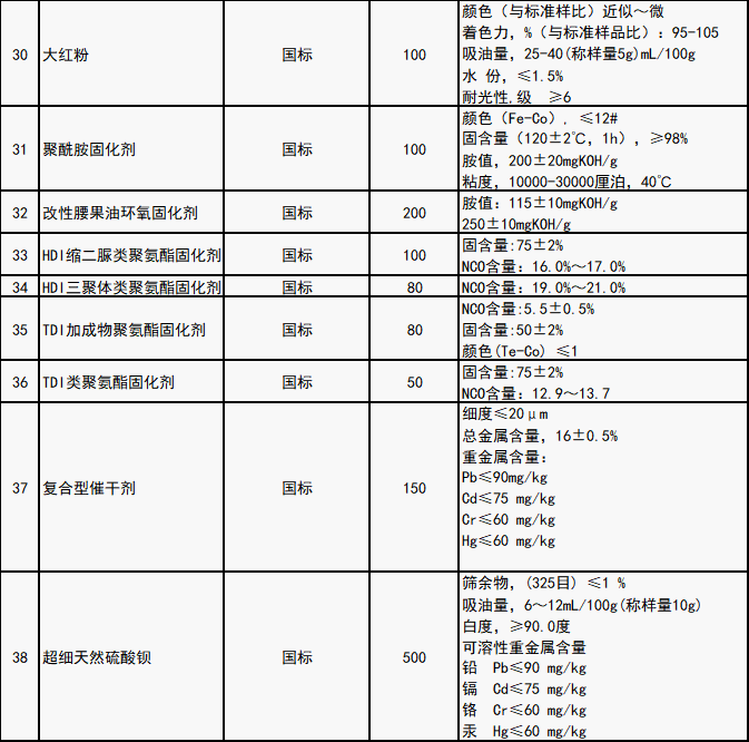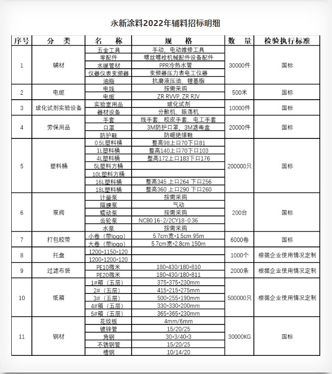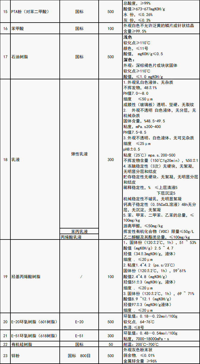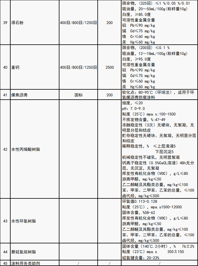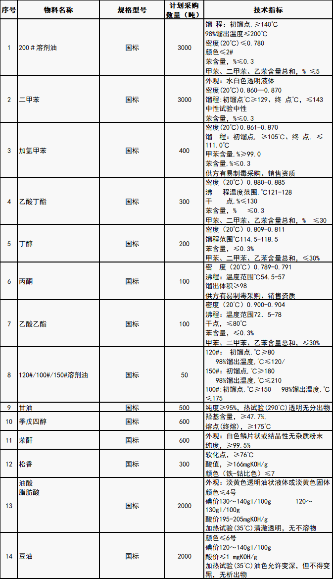 涂料生產主要原輔材料(見附件)。其他未列入目錄的涂料生產所需原料,廠家或貿易商均可按要求投標。
