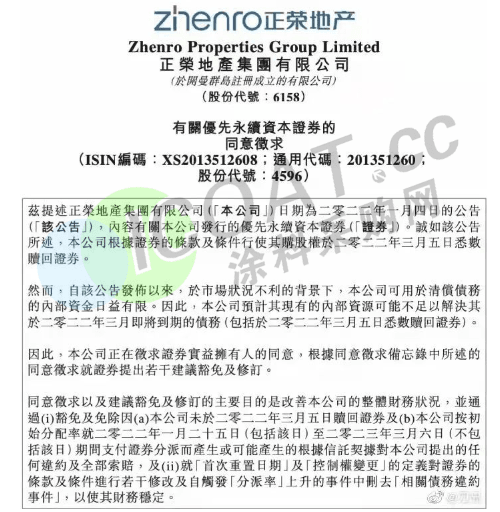 正榮地產公告稱,公司資源不足以支付2億美元永續債,正嘗試征求證券實益擁有人的同意,就證券提出若干建議豁免及修訂。