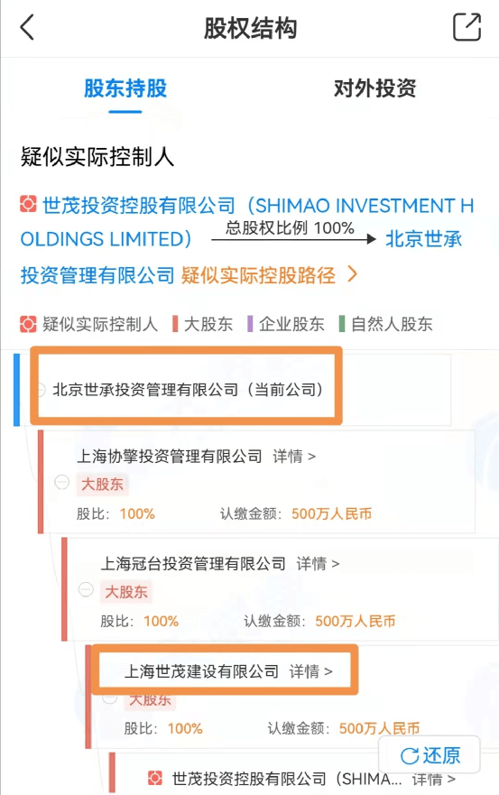 據天眼查,該項目融資主體上海茂舒建材為上海沛廈貿易有限公司100%持股全資子公司,上海沛廈70%股權由北京帕冉工程咨詢有限公司持有,另外30%股權由北京世承投資管理有限公司持有,而經過層層穿透后,北京世承投資為上海世茂建設旗下公司。