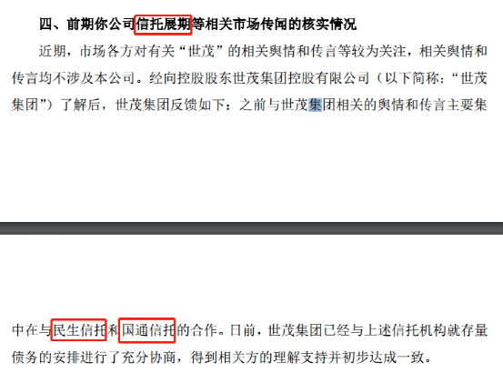 接著在2021年12月30日,世茂集團旗下世茂股份公告稱,之前與控股股東世茂集團相關的輿情和傳言主要集中在與民生信托和國通信托的合作,并表示“日前,世茂集團已經與上述信托機構就存量債務的安排進行了充分協商,得到相關方的理解支持并初步達成一致”。