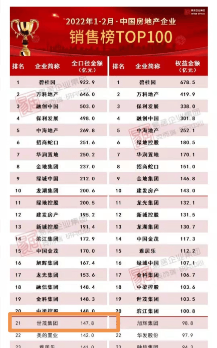 3月1日,地產第三方機構克而瑞公布全國百強房企今年1-2月累計銷售排行榜,世茂集團合計銷售金額(全口徑)僅錄得147.8億元,排名跌至第21。去年前兩月,世茂的這一銷售數據為370.1億元,全面排名達到第12,時隔一年銷售金額暴降60%,排名降了9位。實際上,去年12月單月世茂的銷售金額降幅更達到70%,也就是說近三個月銷售降幅在60%以上。