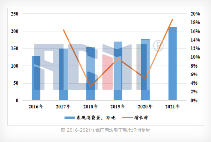 那為什么公司一下子再新增36萬噸丙烯酸丁酯產(chǎn)能,主要還是得益于該產(chǎn)品需求旺盛,據(jù)小編統(tǒng)計,近幾年我國丙烯酸丁酯需求不斷提升,從2016年的129萬噸迅速增至2021年的212萬噸,復(fù)合年均增長率達(dá)到10.4%。尤其是2021年消費同比增長18.7%。