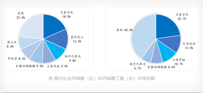 據(jù)小編所知,原有一期項目建成后,衛(wèi)星化學(xué)丙烯酸產(chǎn)能達(dá)到66萬噸/年和62萬噸/年,此次若技改項目全部投產(chǎn),丙烯酸、丙烯酸丁酯產(chǎn)能將分別增至84萬噸/年、98萬噸/年。從現(xiàn)有已投產(chǎn)產(chǎn)能來看,衛(wèi)星化學(xué)丙烯酸和丙烯酸丁酯產(chǎn)能均位居全國第一,占比分別達(dá)到18.5%和22.7%。