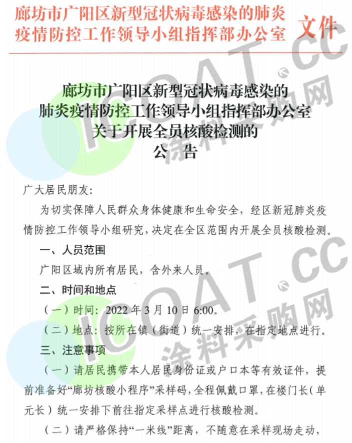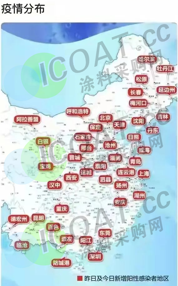 據涂料采購網不完全統計,目前已有十幾個省市地區加嚴了疫情管控措施,陜西、天津、吉林、內蒙古等多個地區開展了全員核酸檢測,且隨著疫情蔓延,不少地區也開始多措并舉“嚴防死守”。