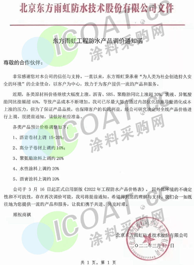 明確表示,將于3月16日起正式啟用新版《2022年工程防水產(chǎn)品價格表》,因外部環(huán)境的不確定性和不可抗性,存在再次調(diào)價可能。