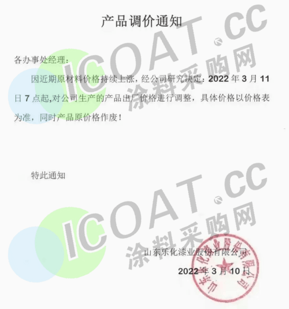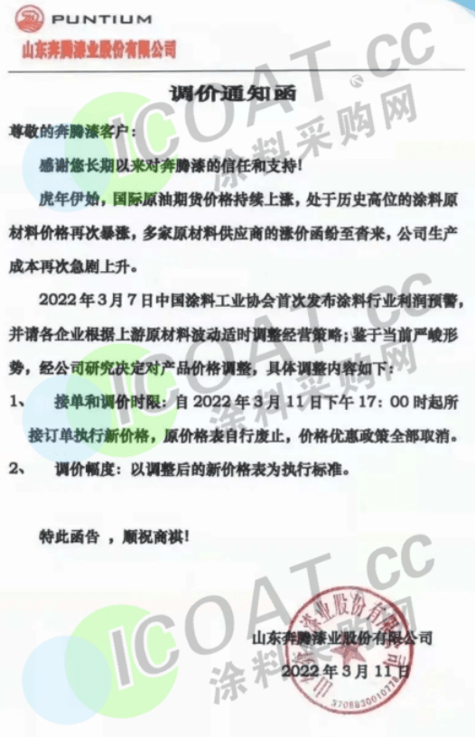 山東奔騰漆業(yè):3月11日下午17:00時起所接訂單執(zhí)行新價格,原價格表自行廢止,價格優(yōu)惠政策全部取消。調(diào)價幅度以調(diào)整后的新價格表為執(zhí)行標(biāo)準(zhǔn)。