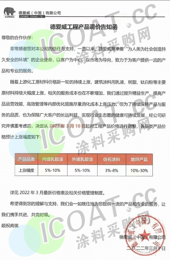 德愛威:工程產(chǎn)品價格上調(diào),內(nèi)墻乳膠漆上漲5-10%,外墻乳膠漆上漲5-10%,仿石涂料上漲3-8%,地坪產(chǎn)品上漲10-30%。