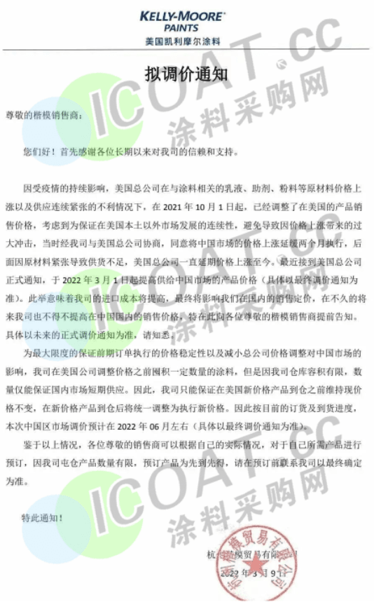 美國凱利摩爾涂料:美國總公司新價格產(chǎn)品到倉之前,中國區(qū)市場現(xiàn)有產(chǎn)品價格維持不變,新價格產(chǎn)品到倉后,統(tǒng)一執(zhí)行新價格,調(diào)價預(yù)計在2022年6月左右(具體以最終調(diào)價通知為準(zhǔn))。