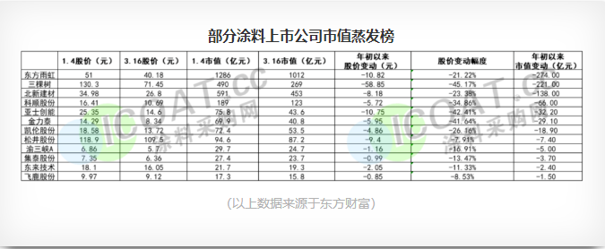 資本市場大跌也讓東方雨虹、科順股份等涂料上市公司,以及龍佰集團、金浦鈦業等涂料上游原料企業股價紛紛下跌,市值也較年初有較大的下滑。