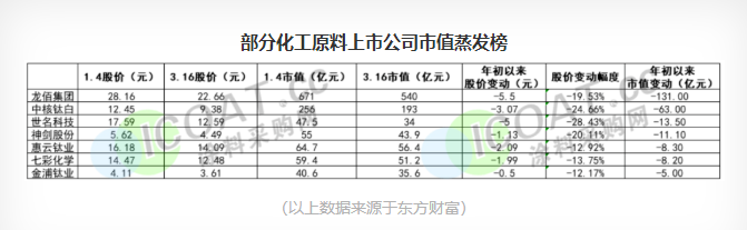 而在化工原料行業,鈦白粉巨頭龍佰集團、中核鈦白、金浦鈦業、惠云鈦業均出現了10%——20%比例的股價下跌,色漿龍頭世名科技股價下跌近30%,聚酯樹脂龍頭神劍股份股價下跌超過20%。另外在市值蒸發方面,龍佰集團年初以來市值蒸發131億元。涂料上游原料上市公司市值累計蒸發240億元,相當于蒸發了半個龍佰鈦業,1個中核鈦白的身價。