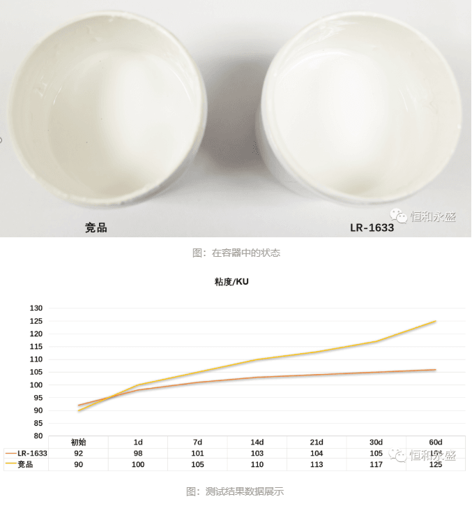 實驗結果:兩者在容器中的狀態均無異常,兩者在50℃烘箱熱貯60天,競品的粘度變化更大,故采用LR-1633無機硅酸鹽乳液貯存穩定性方面有著更好的表現。