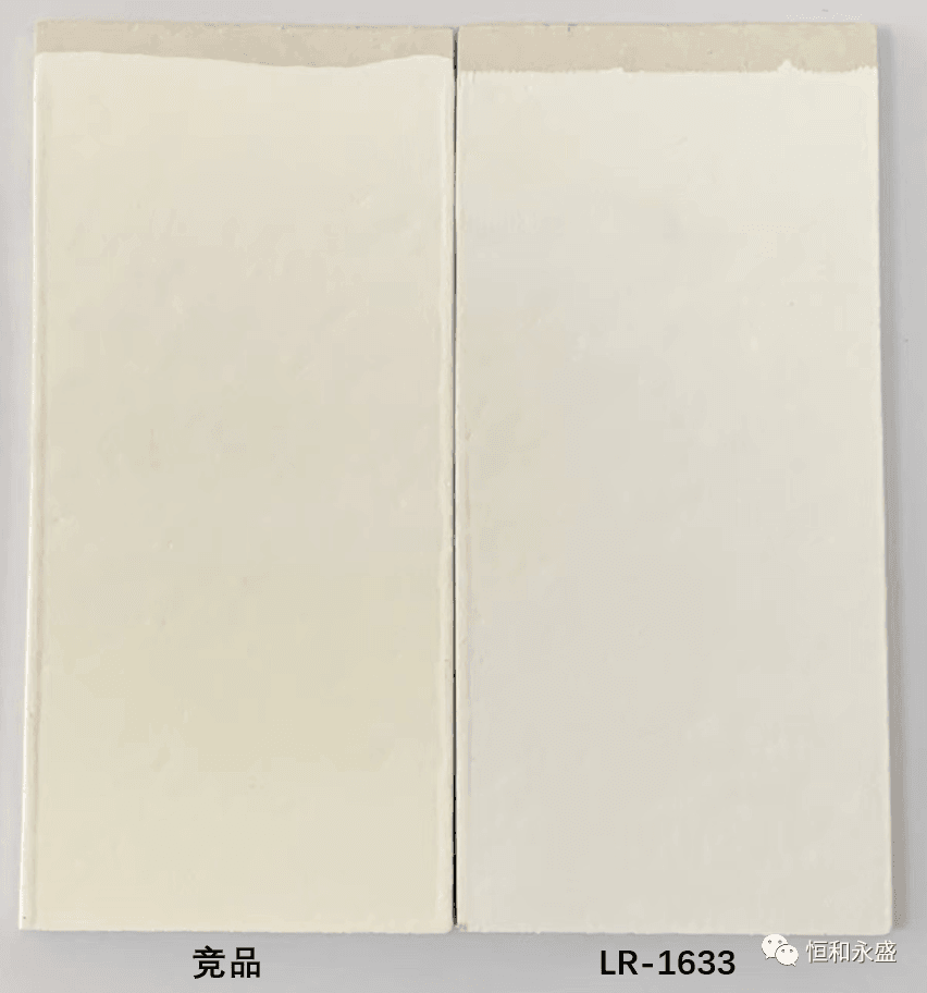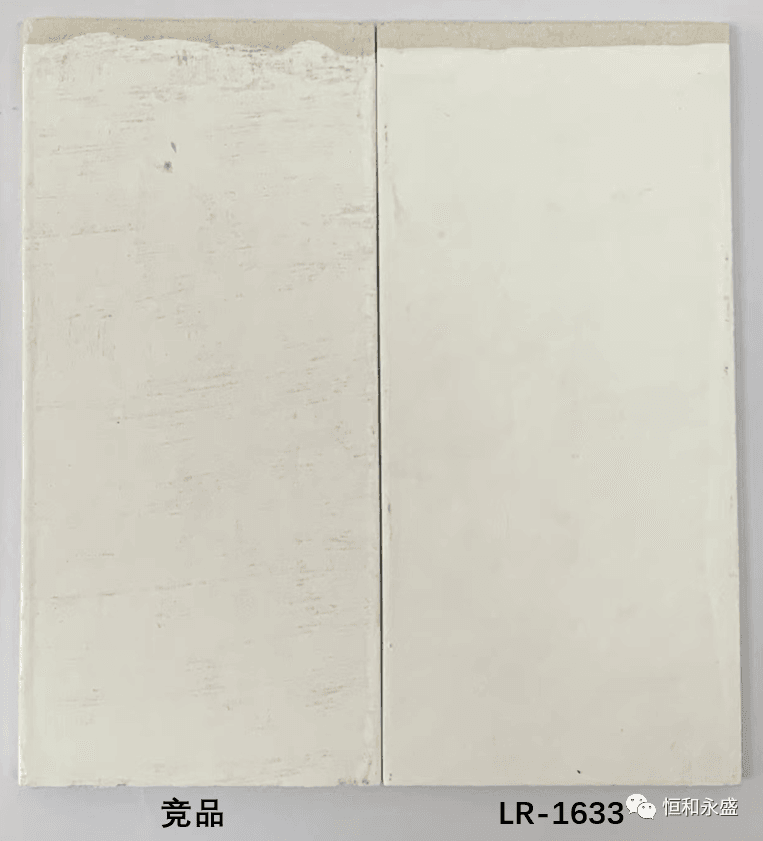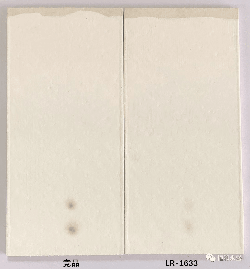 實驗結果:LR-1633泡水未出現起泡、掉粉、明顯變色等涂膜病態現象,而競品有掉粉現象,可見LR-1633的耐水性更佳。