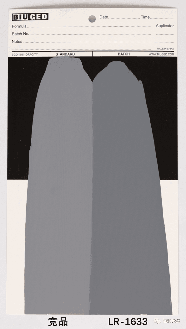 實驗結果:通過LR-1633紙卡展色對比以及LR-1633水泥板展色對比可以看出,LR-1633展色明顯優于競品。