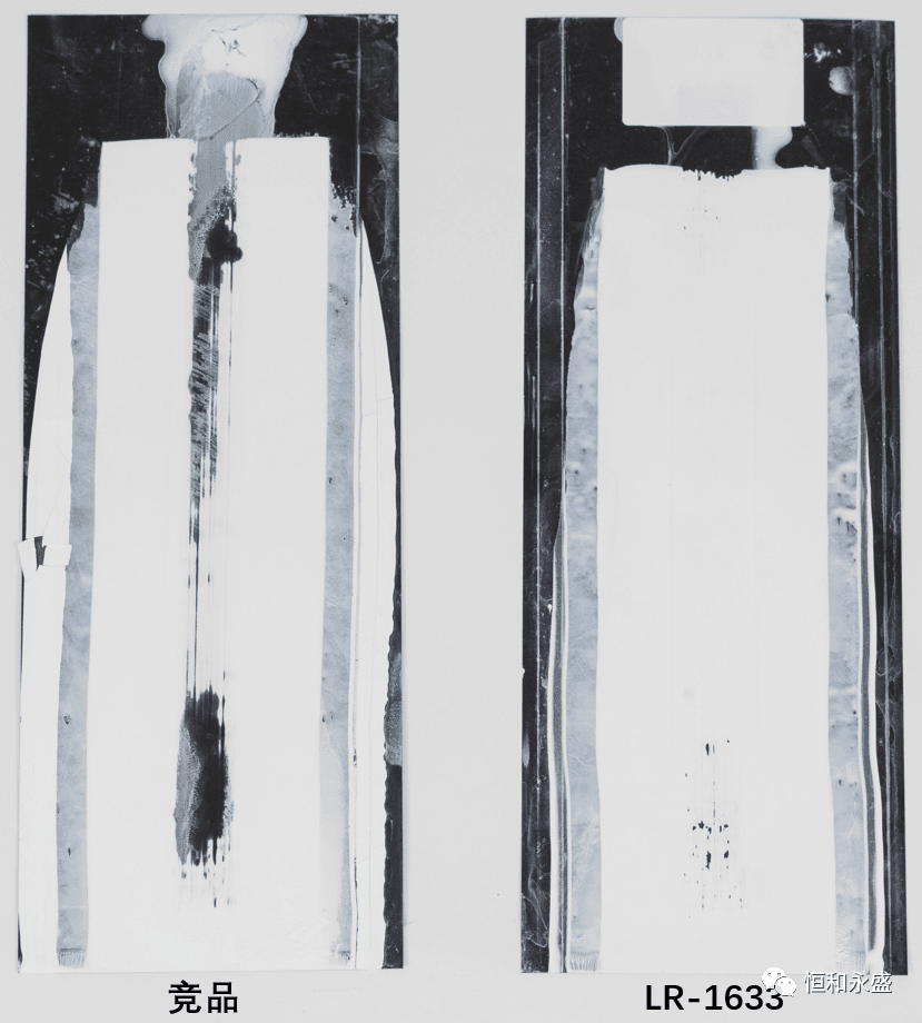 實驗結果:耐堿性表現上,競品有粉化現象,LR-1633無異常反應,故LR-1633耐堿性比競品佳。