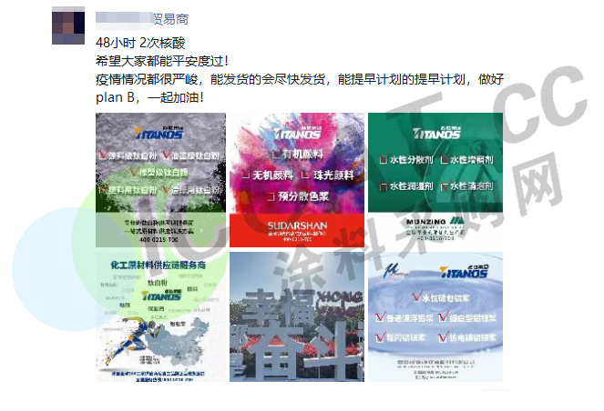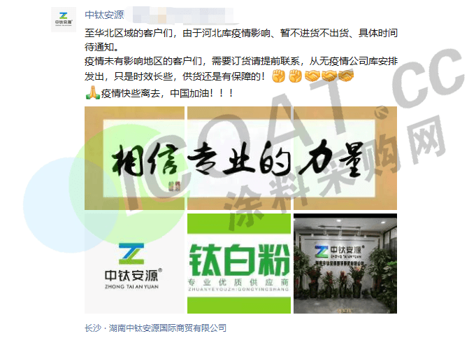 某鈦白粉貿易商表示,由于河北庫疫情影響、暫不進貨不出貨、具體時間待通知。疫情未有影響地區的客戶們,需要訂貨請提前聯系,從無疫情公司庫安排發出,只是時效長一些。