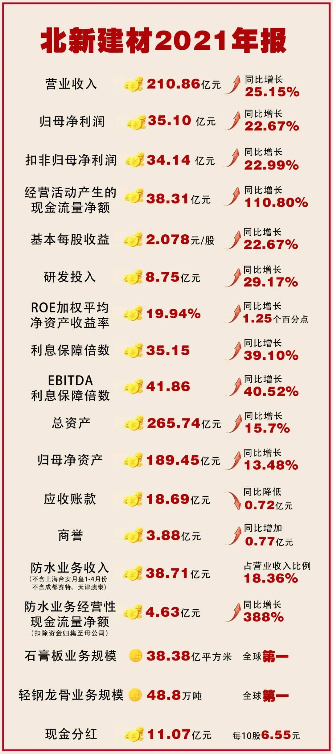 十八年來,北新建材實現年均凈利潤復合增長率近30%(扣除非經常性損益),經營業績和經營質量各項指標高質量發展,創造了制造業穿越周期實現可持續高質量增長的奇跡。北新建材戰略、經營、管理、創新、業績、黨建實現全方位跨越式發展和本質性飛躍。2004年從北京一家石膏板廠兩條生產線起步,實施聚焦戰略和制高點戰略,通過全國布局和聯合重組,3年躍居中國第一、5年躍居亞洲第一,8年躍居世界第一;2019年制定“一體兩翼、全球布局”發展戰略,目前已投產、擴產和簽約石膏板業務規模達38.38億平方米,繼續保持全球最大石膏板產業集團領先地位,在一個充分競爭、完全開放的制造業贏得全國60%、全球19%的市場份額;輕鋼龍骨業務規模達48.8萬噸,躍居全球最大輕鋼龍骨產業集團;進軍防水材料三年時間,躍居全國前三;組建中國涂料復興聯盟,贏得行業協會和行業主要企業廣泛支持;完成五大海外石膏板生產基地布局,亞非歐第一階段全球化布局順利落地。