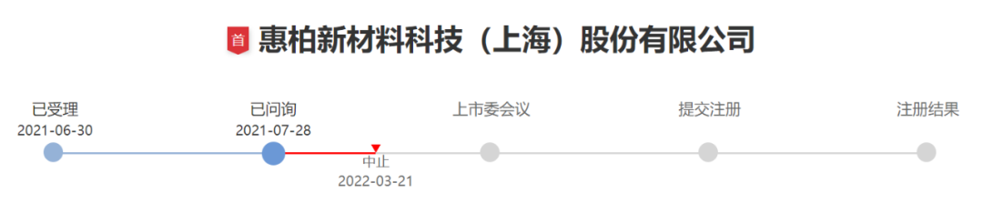 2022年3月21日,因受新冠疫情影響,發行人及保薦人主動申請中止發行上市審核程序,根據《深圳證券交易所創業板股票發行上市審核規則》第六十四條的相關規定,深交所中止惠柏新材發行上市審核。