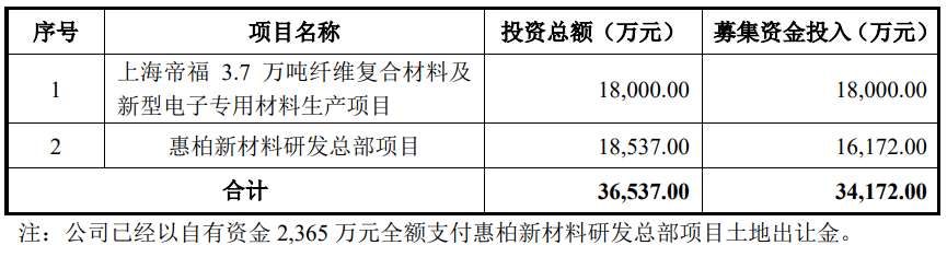 公司擬公開發行股票總數不超過2306.67萬股,擬募集資金3.42億元,將分別用于上海帝福3.7萬噸纖維復合材料及新型電子專用材料生產項目和惠柏新材料研發總部項目。