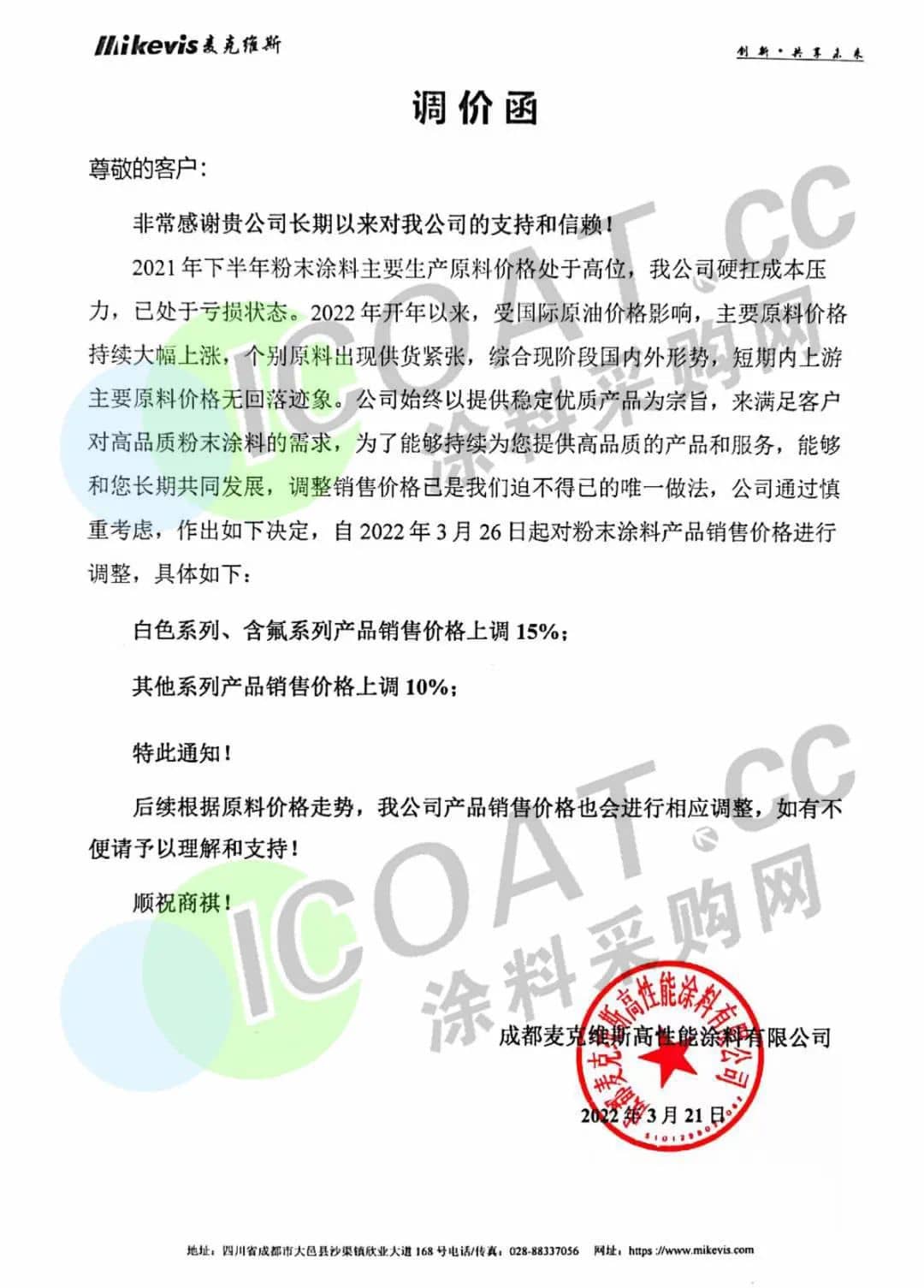 近日,成都麥克維斯高性能涂料發布調價函,稱2022年開年以來,受國際原油價格影響,主要原料價格持續大幅上漲,個別原料出現供貨緊張,且短期內上游原料價格無回落跡象。調整銷售價格已成為迫不得已的做法,因此決定自3月26日起,對粉末涂料產品銷售價格進行調整,白色系列、含氟系列產品銷售價格上調15%,其他系列產品銷售價格上調10%。
