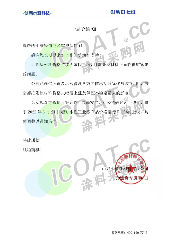 山東七維新材料:3月21日起,水性工業漆產品價格進行5%-10%的上調,具體調整以通知為準。
