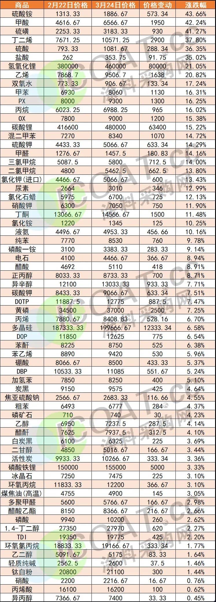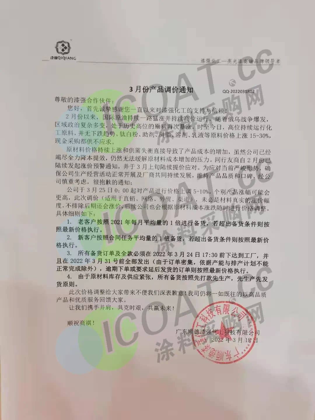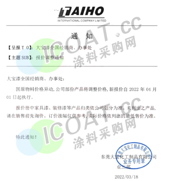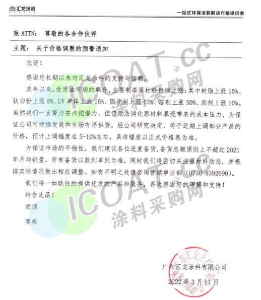 廣東順德漆強化工:3月25日0時起,對產品進行價格上調5%-10%,個別產品漲幅可能會更高,后續也會根據原材料成本漲跌隨時進行價格調整。