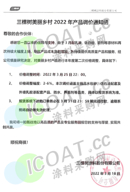 三棵樹涂料:3月25日起,對美麗鄉村產品進行本年度第二次價格調整,價格調整幅度2%-6%,本次調價涵蓋水包砂、仿石漆配套及外墻乳膠漆配套產品、防水、界面劑等品類,具體以報貨系統為準!