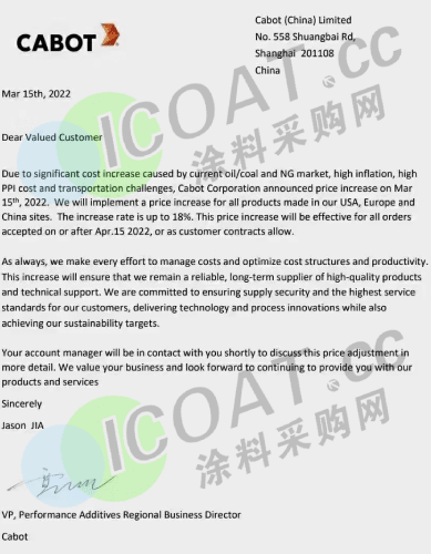 卡博特:由于目前石油/煤炭和天然氣市場的上漲,4月15日起將提高在美國、歐洲和中國生產的所有產品的價格,價格上漲18%。
