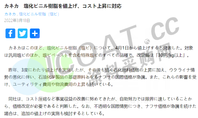 鐘化株式會社:4月1日起提高PVC樹脂的價格,包括通用PVC和PVC糊在內的所有特殊PVC品種價格上漲30日元/kg(約合1601元/kg)以上。