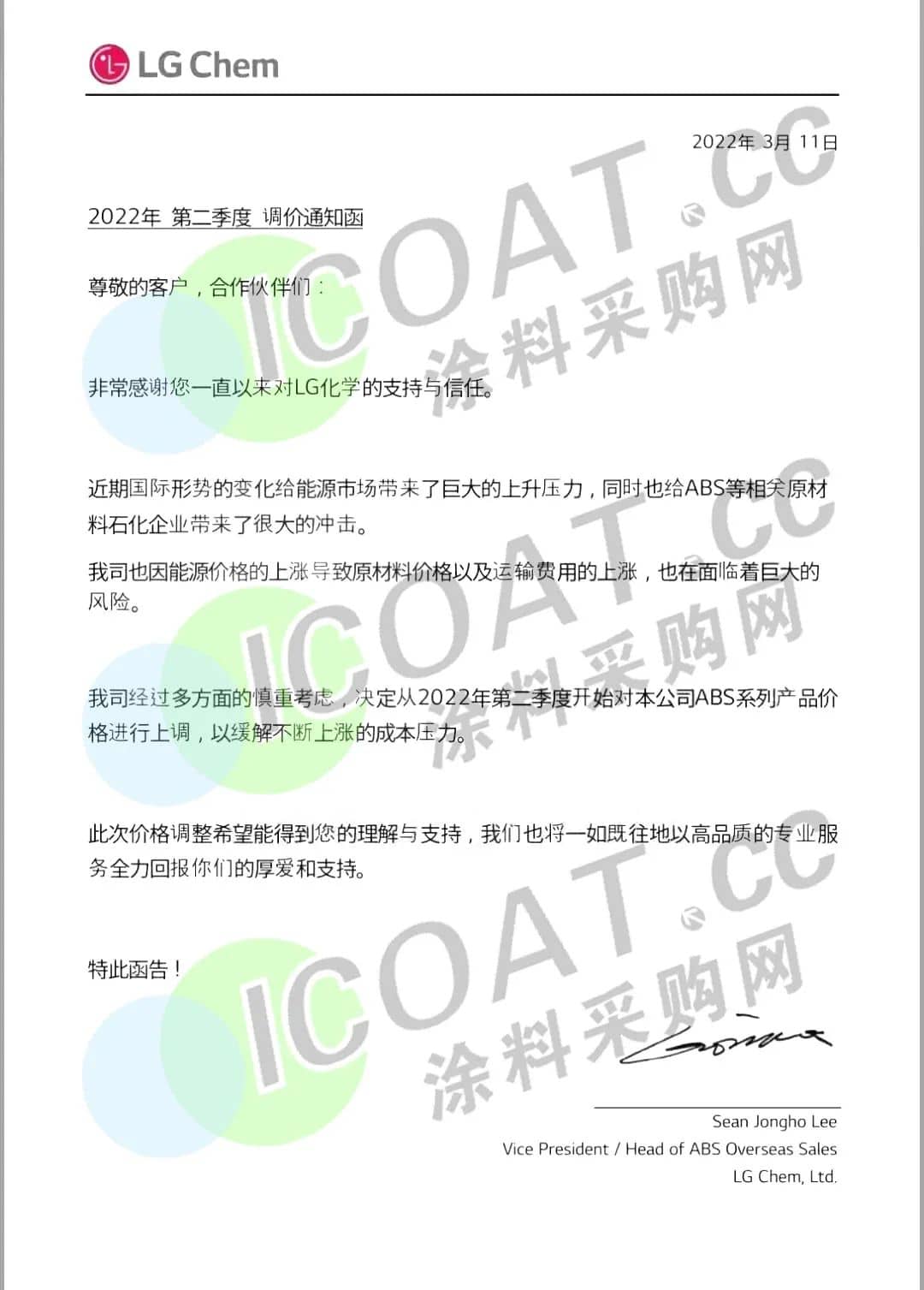 LG化學:自第二季度開始,將針對ABS系列產品進行提價。